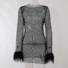 Long sleeve solid see through sheer mesh fluffy round neck mini dress